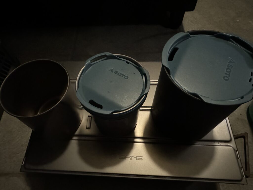 次に、SOTOのサーモスタックマグを使って湯を沸かしました。このマグは便利な3サイズスタッキング機能があり、750mlで湯を沸かした後、400mlに350mlをスタッキングして、ダブルウォールマグとしてコーヒーを淹れました。ダブルウォールの構造で、コーヒーが長時間温かく保たれるのが魅力です。