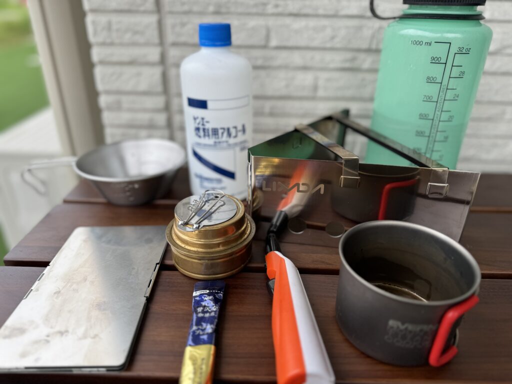 以前は固形燃料で湯沸かしと炊飯、カップラーメンとメスティンで炊いたごはんを食べると言うのは出来ましたので、もうひとつステップアップ、アルコールバーナーを使う、をやってみたいと思います♬