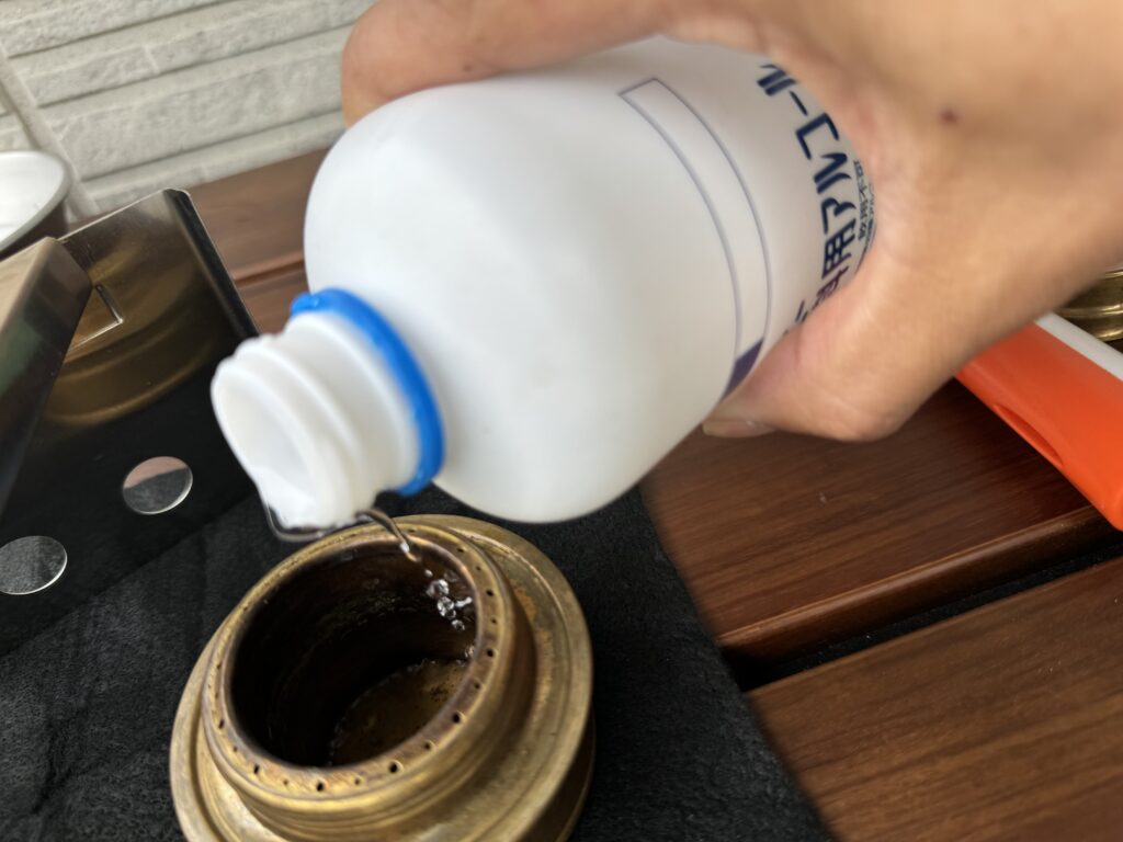 アルコールバーナーの蓋を開けアルコール燃料を溢さないように注ぎます、出来たら五徳を組み立て、セットして、、、
