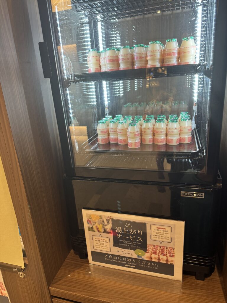 朝食後は、天然温泉でリラックス。朝風呂で体を温め、風呂上がりには無料の乳酸菌飲料を飲んで一息つきました。