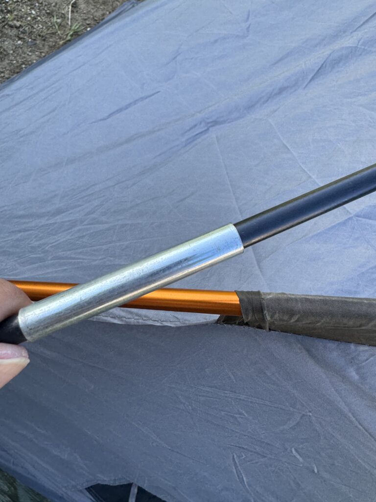 シルバーのポールが純正品で、インナーテントスリーブに引っかかり使いにくかったのと、傷んできたので新たにオレンジのポールをAmazonで導入しました↓