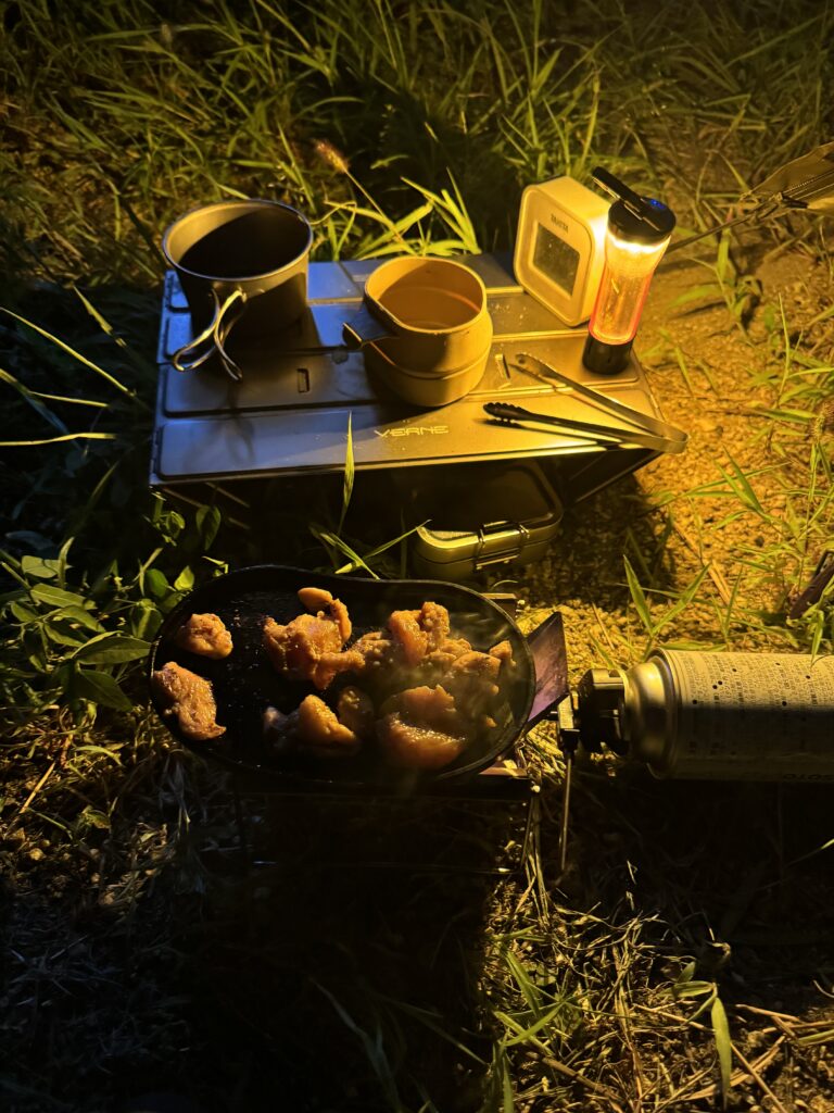冷凍のけいちゃんは、手軽に調理できるうえに、鉄板で炒めるとさらに美味しくなります。キャンプ料理の時間を大幅に短縮できるので、ソロキャンプの時間をのんびり過ごせました。