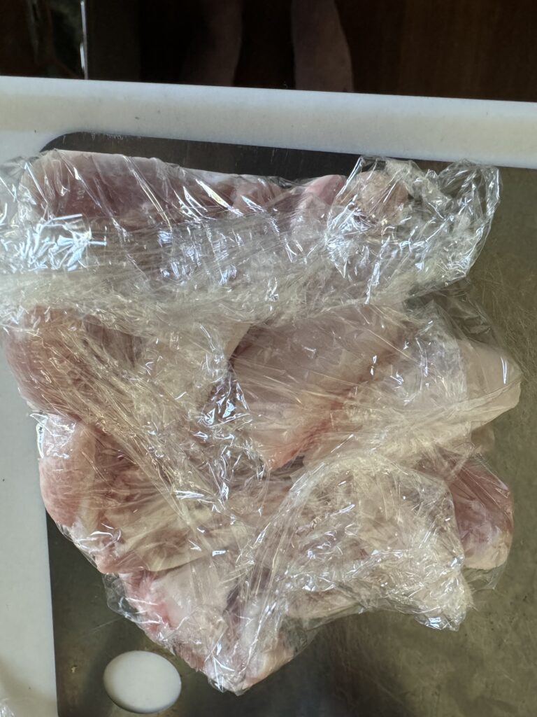 ↓パック入りのお肉などは、パックから出してラップで包むだけでかなりコンパクトになります。