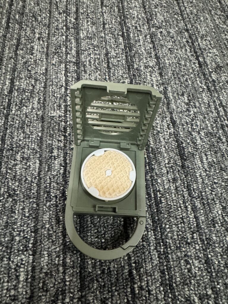 まず、本体の前面カバーを開けてカートリッジをセットします。これがCanoxの心臓部で、蚊よけ効果を発揮する部分です。