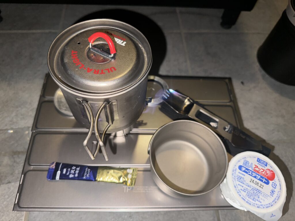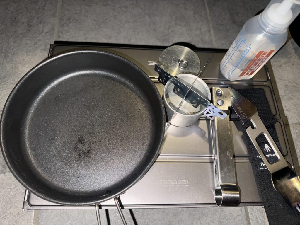 仕事が遅くなった夜、妻が残してくれた晩ごはんを玄関で楽しむことにしました。使ったのは、RSRアルコールストーブとエバニューチタン十字ゴトク。そして、キャプテンスタッグのたためるミニパンです。このミニパンは軽いアルミ製で、コーティングが施されているので、焦げつきがほぼゼロ。使用後もウェットティッシュでさっと拭くだけで汚れが落ちるので、とても便利です。