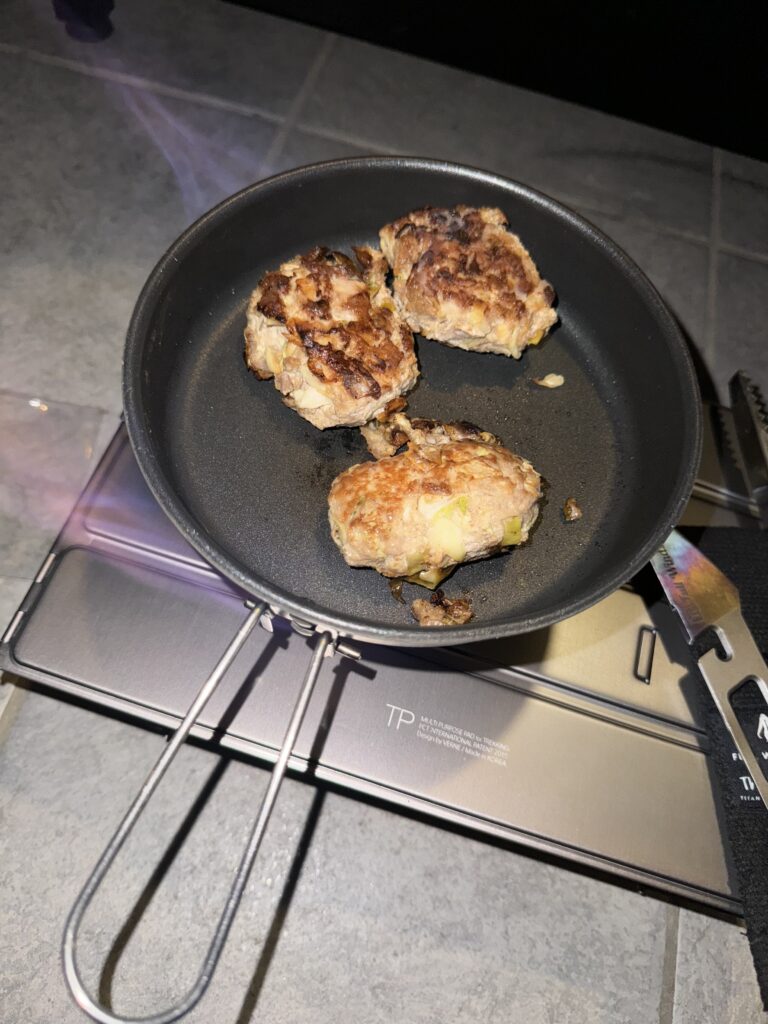 このミニパンを使って、自家製餃子バーグ(餃子の中身を捏ねてハンバーグにしたもの)を焼き直しました。アルコールストーブでしっかりと温めた特製バーグを、温かいご飯に乗せて、玄関で即席の「餃子バーグ丼」が完成。玄関先でのこのキャンプスタイルが、なんだか特別な時間に感じられます。