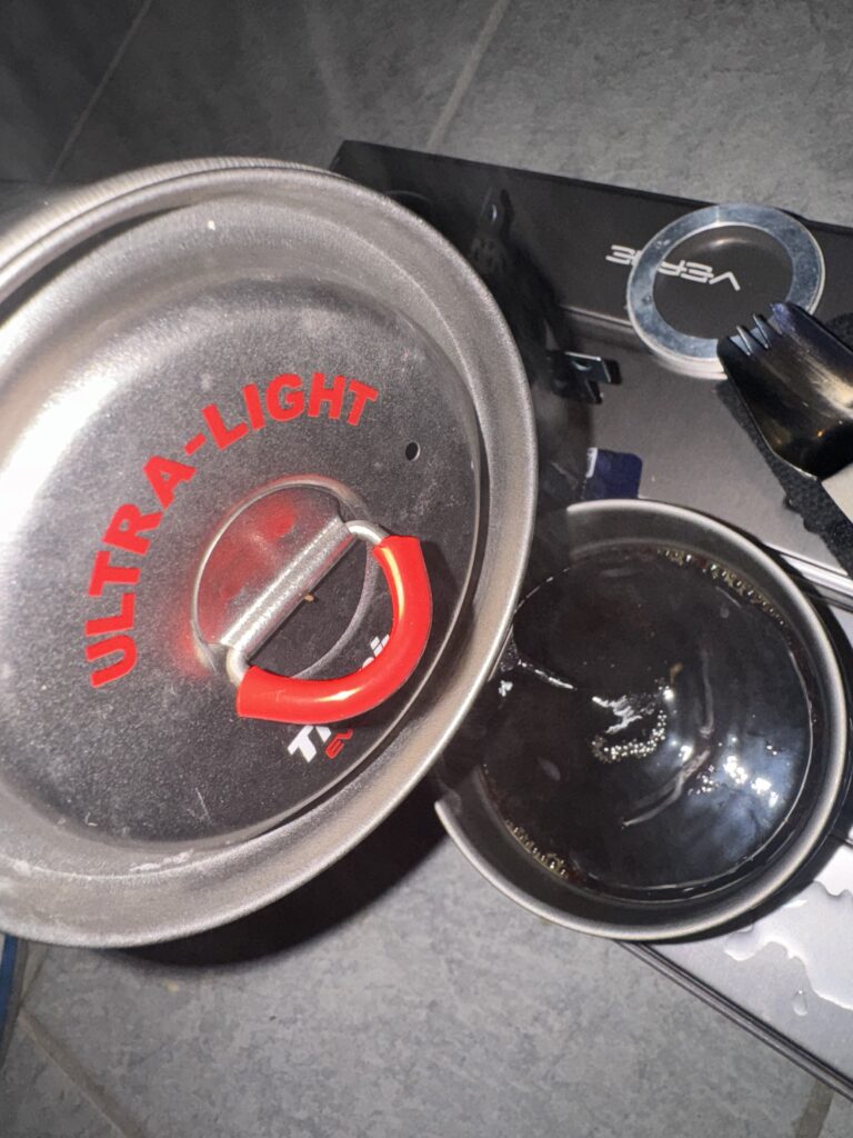 晩ごはんをしっかり楽しんだあとは、アルコールストーブで再びお湯を沸かし、インスタントコーヒーを淹れました。暑い夜だったので、コーヒーはアイスコーヒーに。お気に入りのチーズデザートと一緒に、食後のひとときをゆっくりと過ごしました。