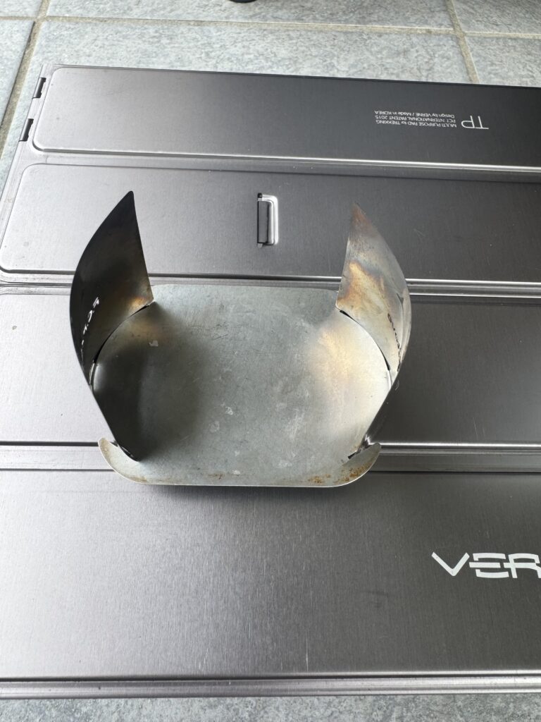 • エアストーブ: CGKとFUKUさんの共同開発による固形燃料用の簡易風防兼五徳を使用しました。軽量でコンパクトながら、しっかりと固形燃料を支えて、安定した湯沸かしが可能でした。