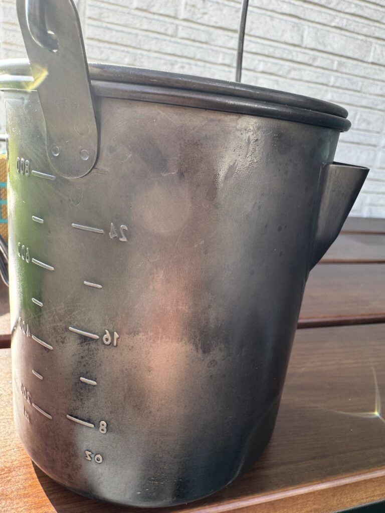 ベイルハンドルで吊るして焚き火にかけると、圧倒的なカッコ良さを感じます。キャンプの雰囲気を盛り上げてくれるアイテムです。