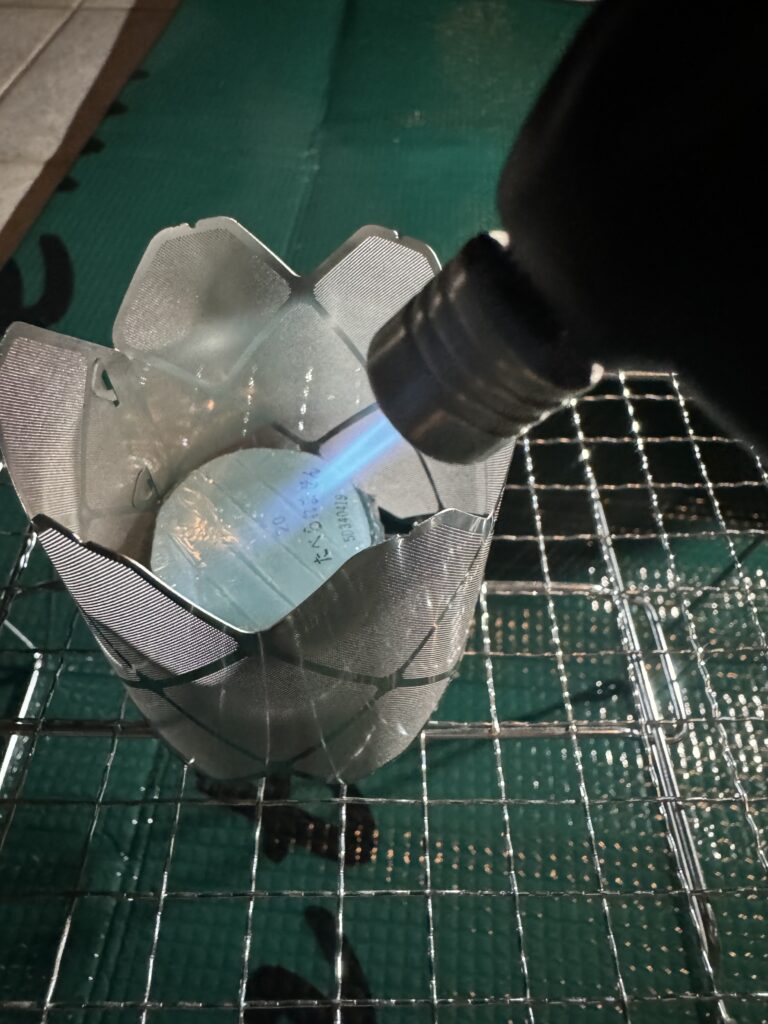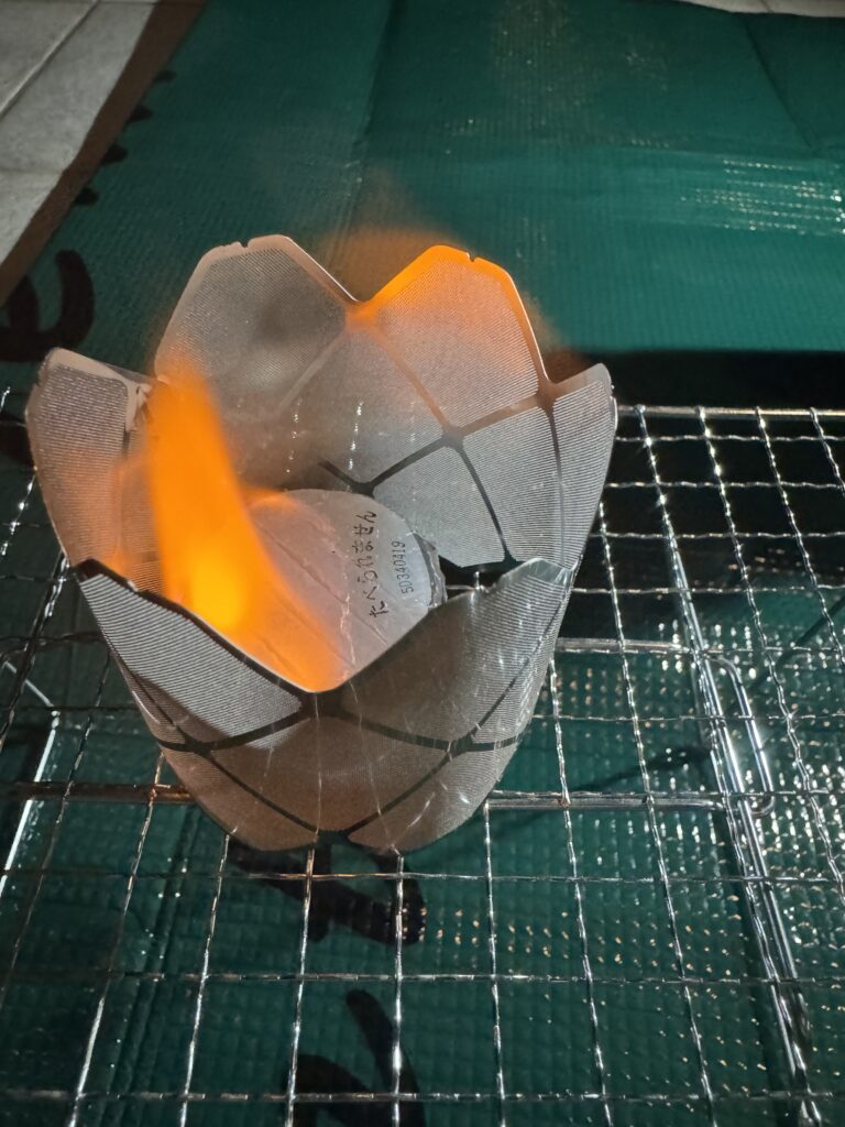 今回は、このミュニークXメッシュストーブSと固形燃料を使ってお湯を沸かしてみました。コンパクトなストーブと固形燃料の組み合わせは、まさにアウトドアでの湯沸かしに最適です。風防を設置し、炎の安定感を確保することで、スムーズにお湯を沸かすことができました。湯気が立ちのぼる様子とともに、ストーブからあふれ出る炎の美しさに、思わず見惚れてしまいます。