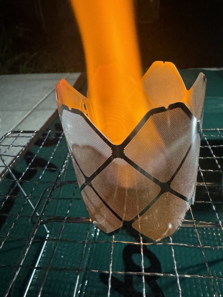 夜の静寂の中、ミュニークXメッシュストーブSをセットして火を灯してみました。真っ暗な闇の中、メッシュ越しに見える炎の輝きが、一段と際立って見えます。新品のステンレスメッシュは、炎の光を柔らかく反射し、あたりをほんのりと照らしてくれます。炎の揺らめきが視線を捉え、まるで夜の空気に溶け込むような幻想的な雰囲気を演出してくれました。
