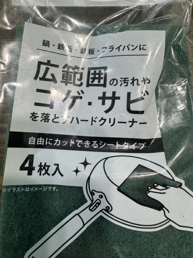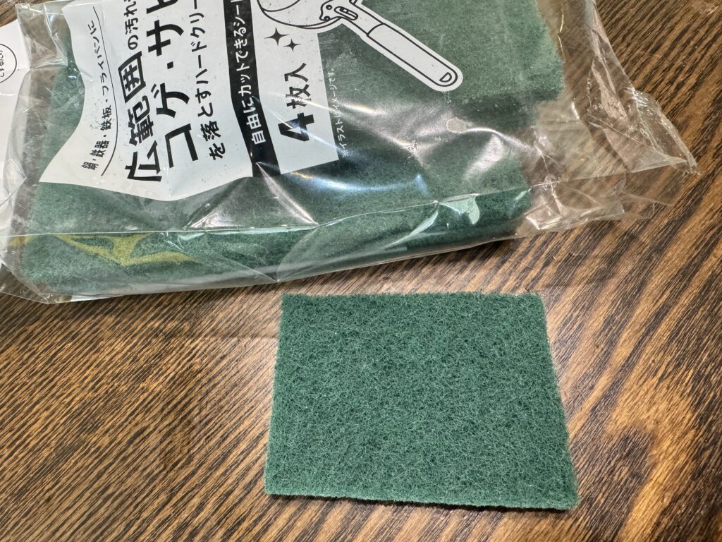 セリアで購入した緑色のナイロンたわしは、4枚入り110円で、非常にコストパフォーマンスが良いです。ボクは1枚を四つに切って使っており、用途に応じて便利に活用しています。このたわしは、頑固な煤汚れやクッカーの焦げつきを落とすのに非常に役立ちます。