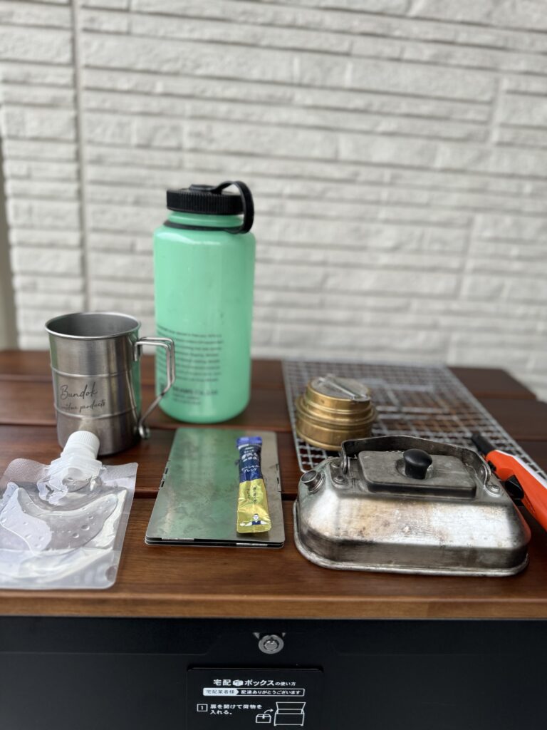 宅配ボックスの天板をテーブル代わりに活用することで、素早くデイキャンプスペースをセットアップできます。さらに、アルコールストーブを使って湯沸かしを行い、スティックコーヒーを淹れることで、贅沢なアウトドア時間を楽しむことができちゃいます♩♩