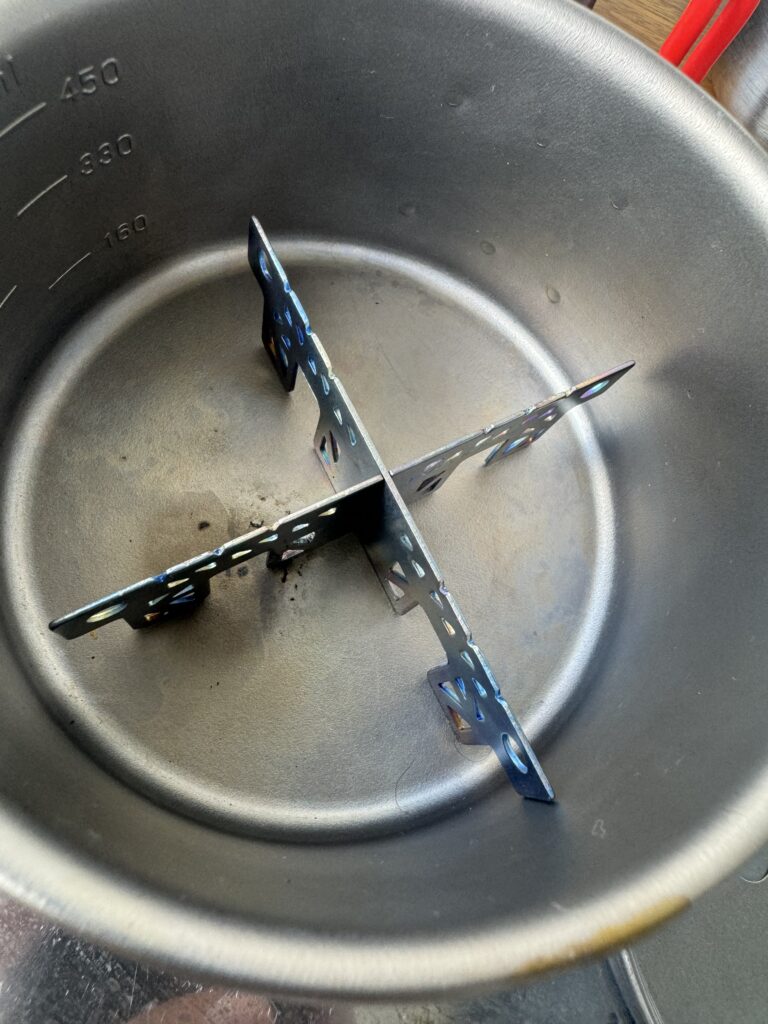 ↑チタン十字ゴトクで嵩上げして蒸し皿をセットします