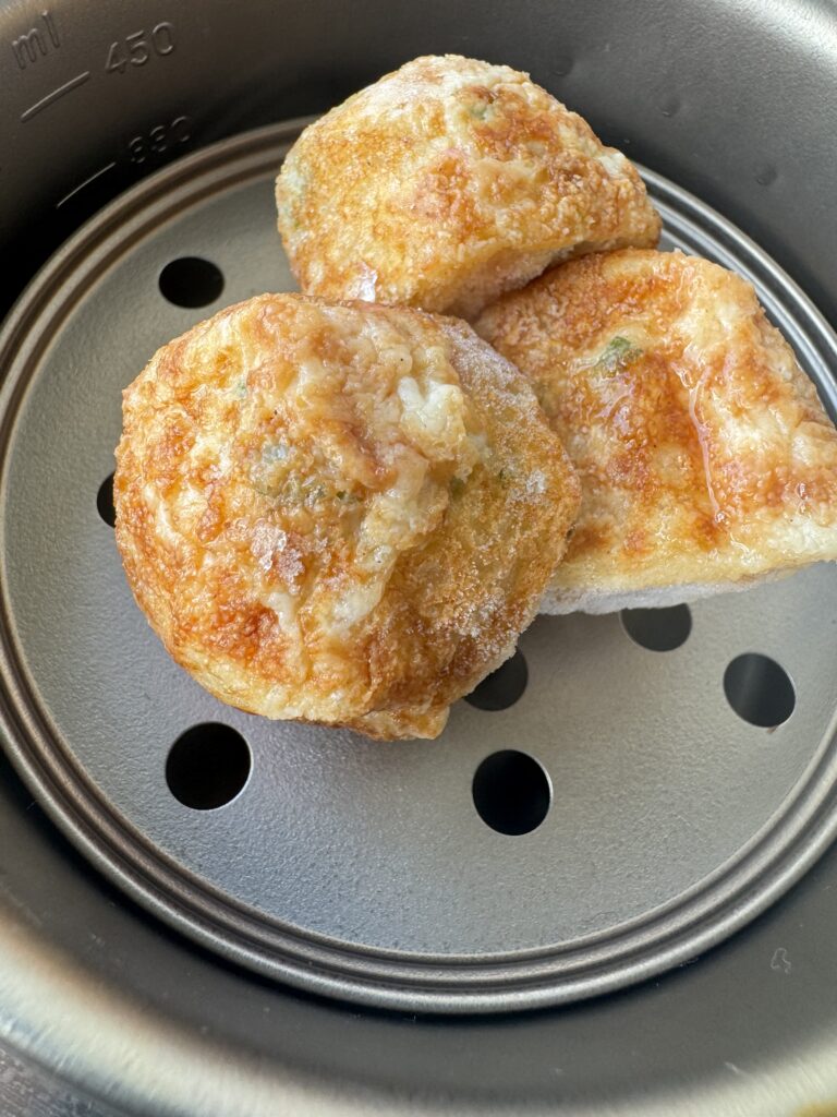 ↑玄関キャンプで冷凍たこ焼きを蒸して温めてみました、奥さんも「ふわっふわで最高!」と大絶賛でした笑