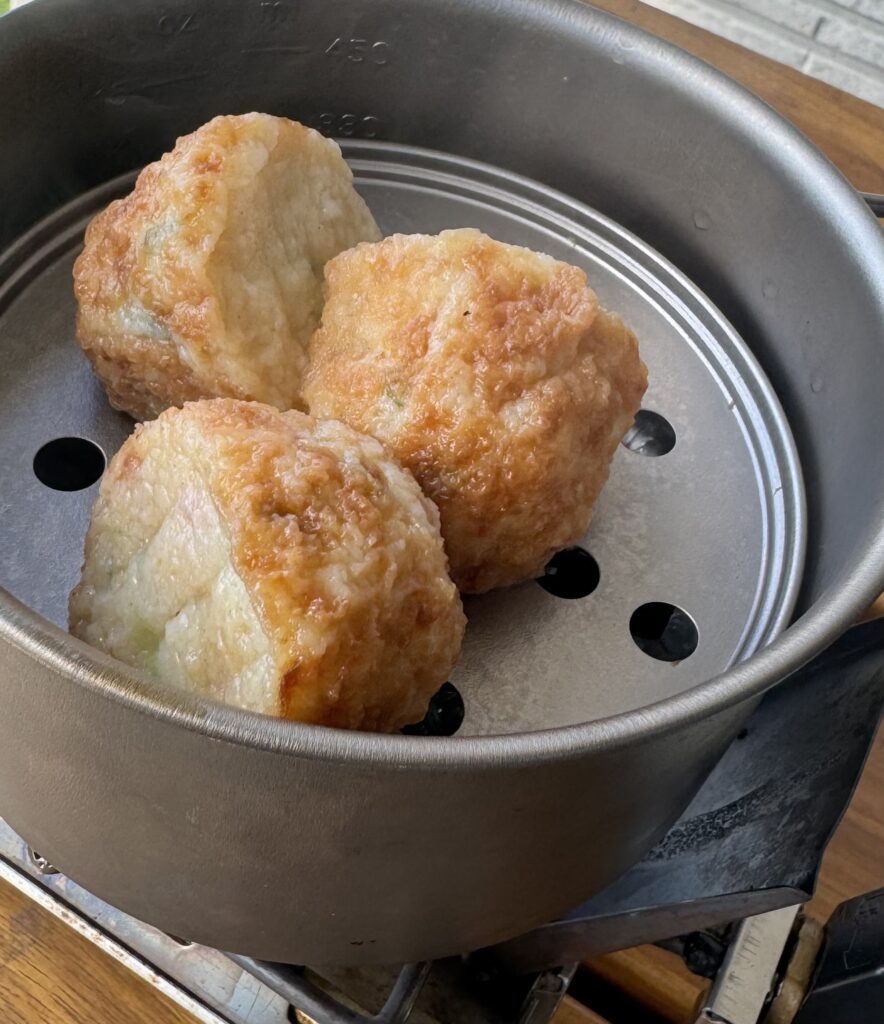 今回、ボクはフリマサイトで偶然手に入れた「エバニュー EBY218 Ti蒸し皿」を使用して、冷凍たこ焼きを蒸してみました。蒸すことで、まるでレンジで温めたかのように手軽に仕上がり、アウトドアでも便利な「蒸し調理」の可能性を感じました。家での調理だけでなく、キャンプやハイキング中でも、このように手軽に使えるのがポイントです。