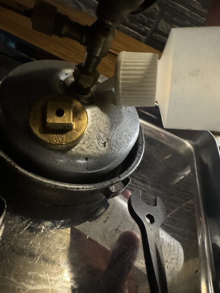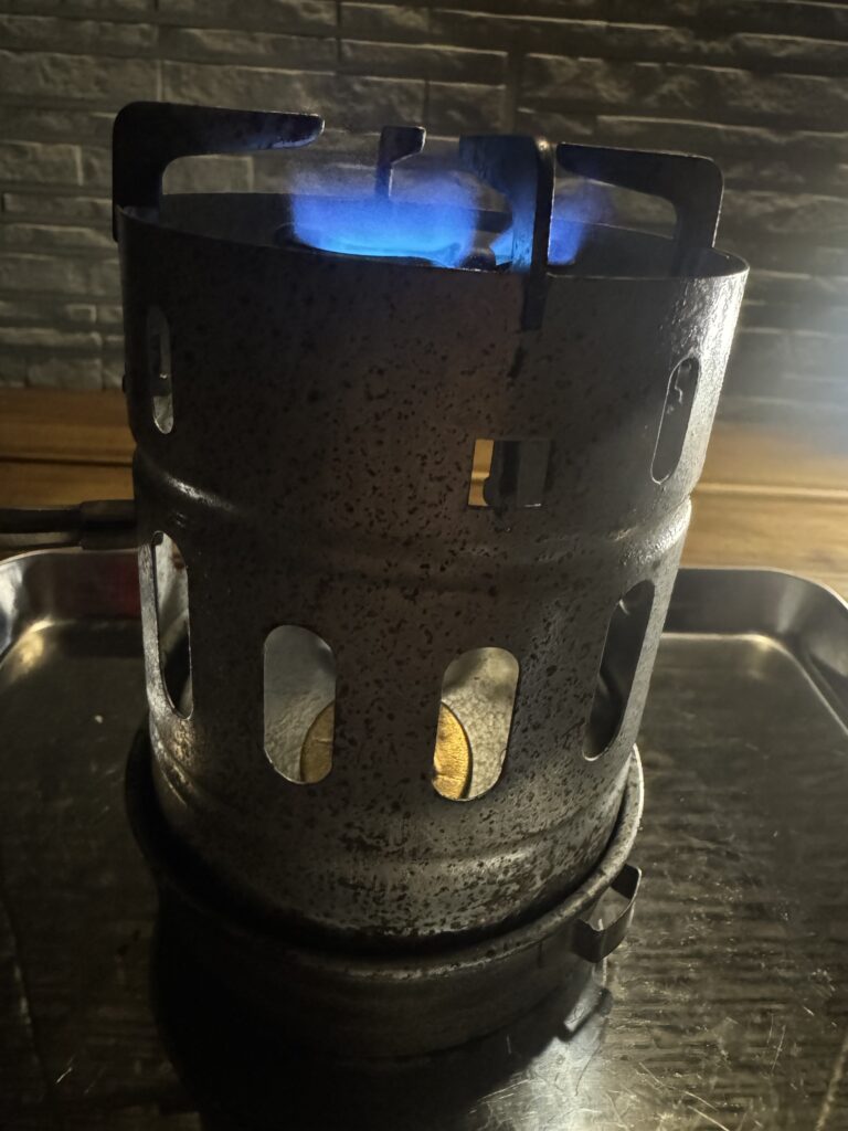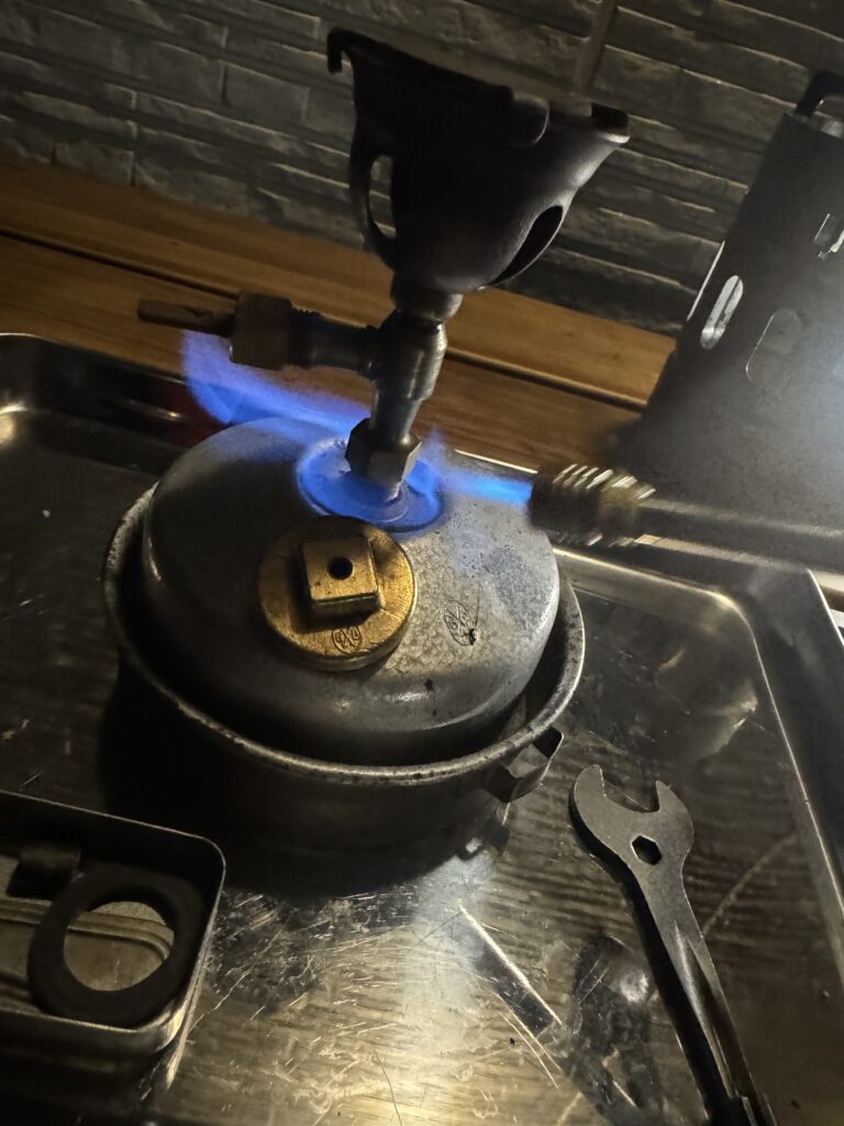 ↑タンクの上、真ん中に窪みがあるのでそこにアルコールを注いで、点火!プレヒート(予熱)します。