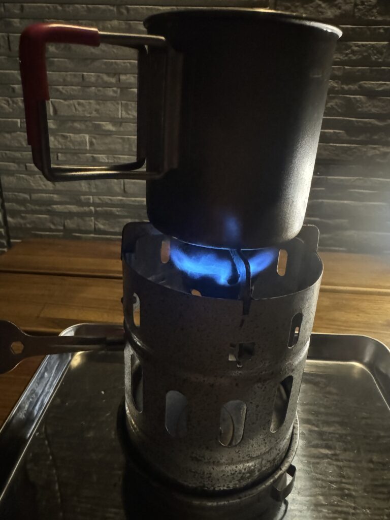 ↑五徳のついた風防ケースを被せて、アルコールが燃え尽きる寸前にバルブを開、元気に燃えてくれました!今回はマグで湯沸かししました。