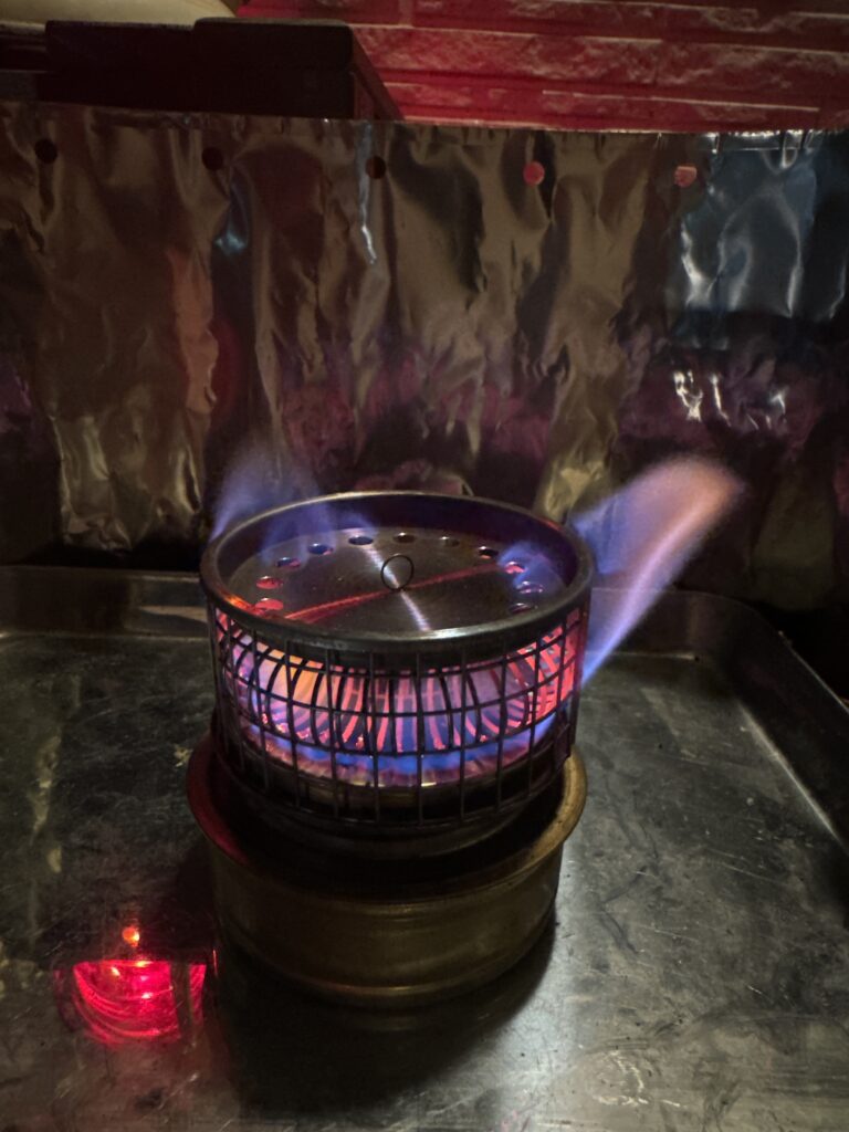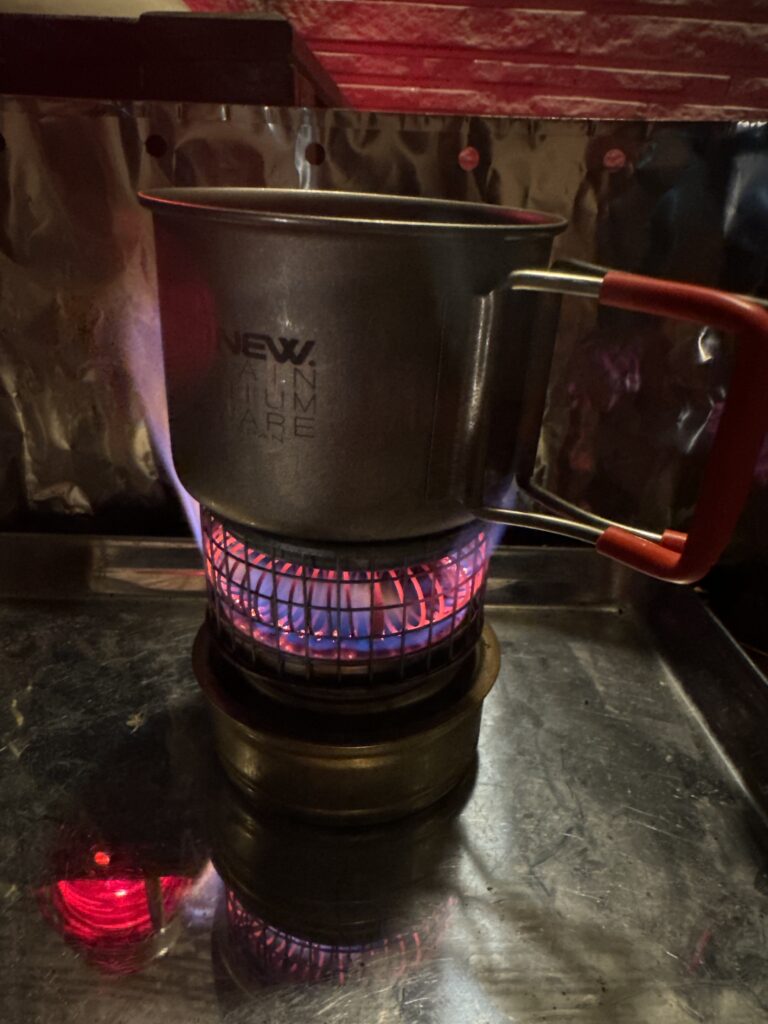 ホットキャンディヒーターは、単に暖を取るだけでなく、その上にカップやクッカーを置いて湯を沸かしたり、冷めた飲み物を温め直すこともできます。プレヒート(事前にアルコールストーブでしっかりと温める作業)を済ませた後、炎がコイルを通してじんわりと暖かくなるのを感じるのが、このヒーターの醍醐味。ゆっくりと温かさが伝わり、ソロキャンプにぴったりの温もりを提供してくれます。急がず、のんびりとした時間を楽しみたい人には最適なヒーターです。