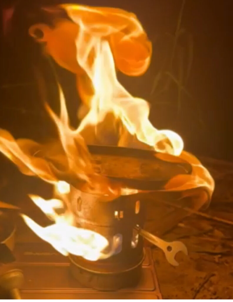 ボクが使用した鉄板はストーブよりも大きく、厚さもありました。これにより、輻射熱がストーブのタンクに直接伝わり、過熱して炎上する原因となりました。タンクが爆発しなくて本当に良かったですが、これは完全に危険な状況でした。大きなクッカーや鉄板の使用はNGです!