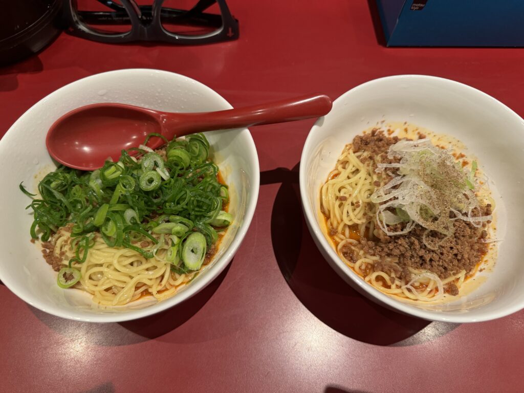 チェックアウト後広島駅に向かったボクたちは、ちょっと早めのランチとして、広島で話題の汁なし担々麺を求めてお店へ向かいました。今回狙っていたのは、人気店「くにまつ」さんと「武蔵坊」さんのコラボメニュー。お二人の店がそれぞれの味をハーフサイズで提供してくれるので、広島の担々麺の魅力を一度に味わえる贅沢なメニューです。