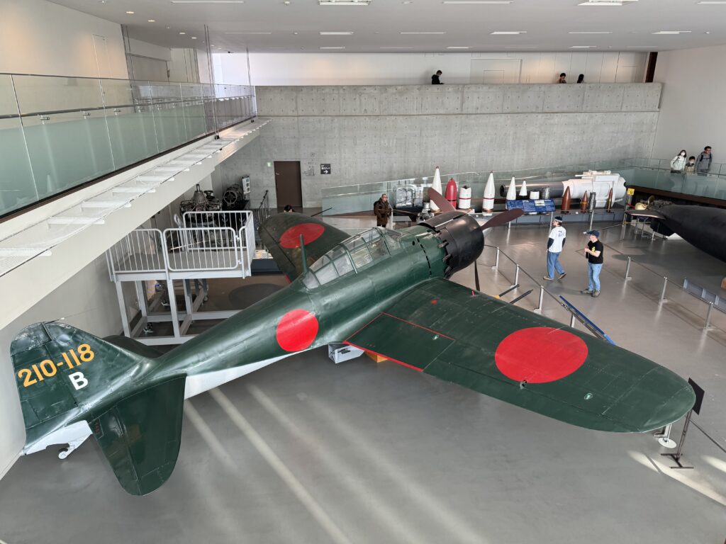 大満足のお昼ごはんを終えた後、ボクたちは広島駅からJR山陽本線で呉に向かい、「大和ミュージアム」に足を運びました。ここは何度訪れても圧倒される場所です。まず目に飛び込んできたのは、戦艦「大和」の1/10スケールの巨大な模型。そして、零式艦上戦闘機、いわゆるゼロ戦も展示されていて、その迫力と歴史の重みを感じます。