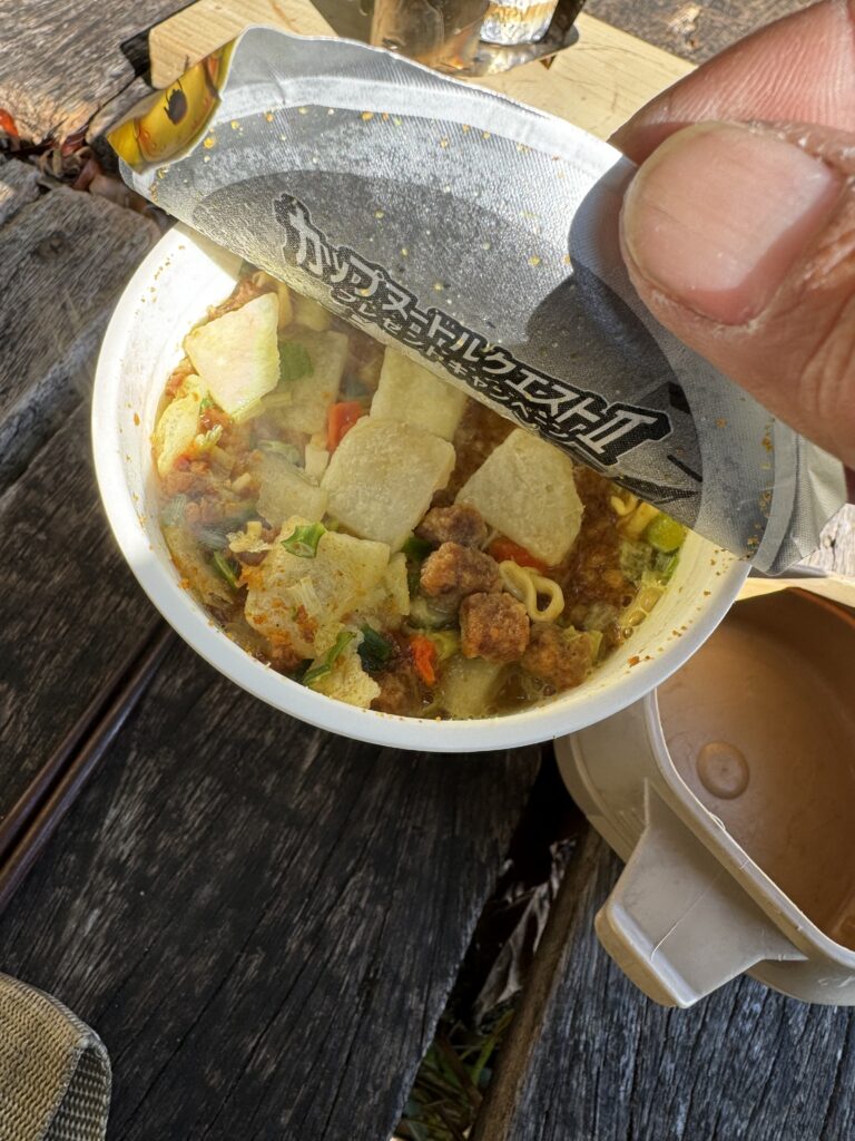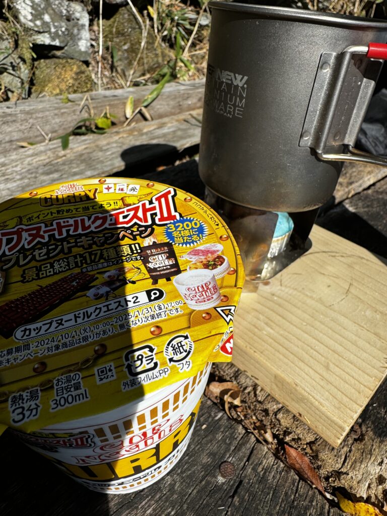 そして、山頂に到着!ジュエル34をセットし、湯沸かしを開始しましたが、どうしても燃焼が思うようにいかない…。そこで、持っていた固形燃料に切り替えてお湯を沸かし、まずはカップヌードルの湯を準備。完璧とは言えませんが、それでも熱々のカップヌードルを山頂で食べると最高のごちそうに感じました。