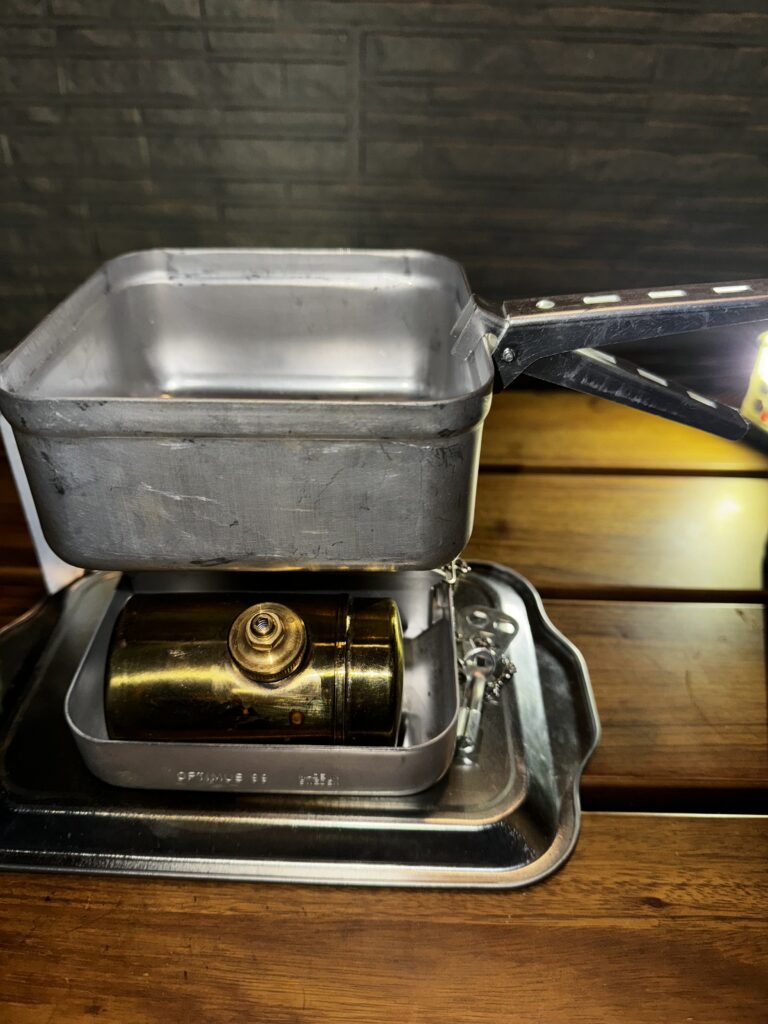 実際にオプティマス99を使ってみたところ、コンパクトで持ち運びやすいだけでなく、調理性能にも大満足。蓋としても使えるクッカーは、袋ラーメンを調理するのに非常に便利で、しっかり温まります。リフターを使うことで、熱い蓋でもガッチリホールドして安全に取り扱うことができます。
