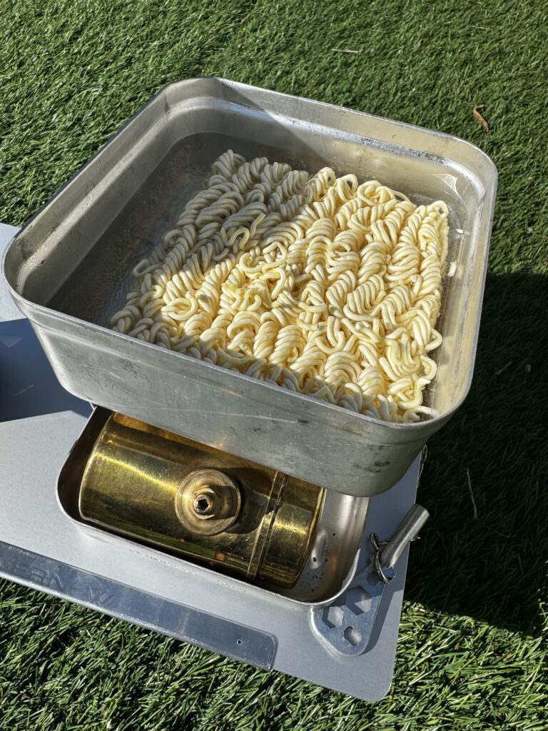 オプティマス99は、750mlサイズのクッカーの蓋としても使用できるので、ちょうど良いサイズで袋ラーメンを調理できます。火力もしっかりしていて、スムーズにお湯が沸かせるので、ラーメンの麺も程よく茹で上がり、スープも温かくて美味しく仕上がります。