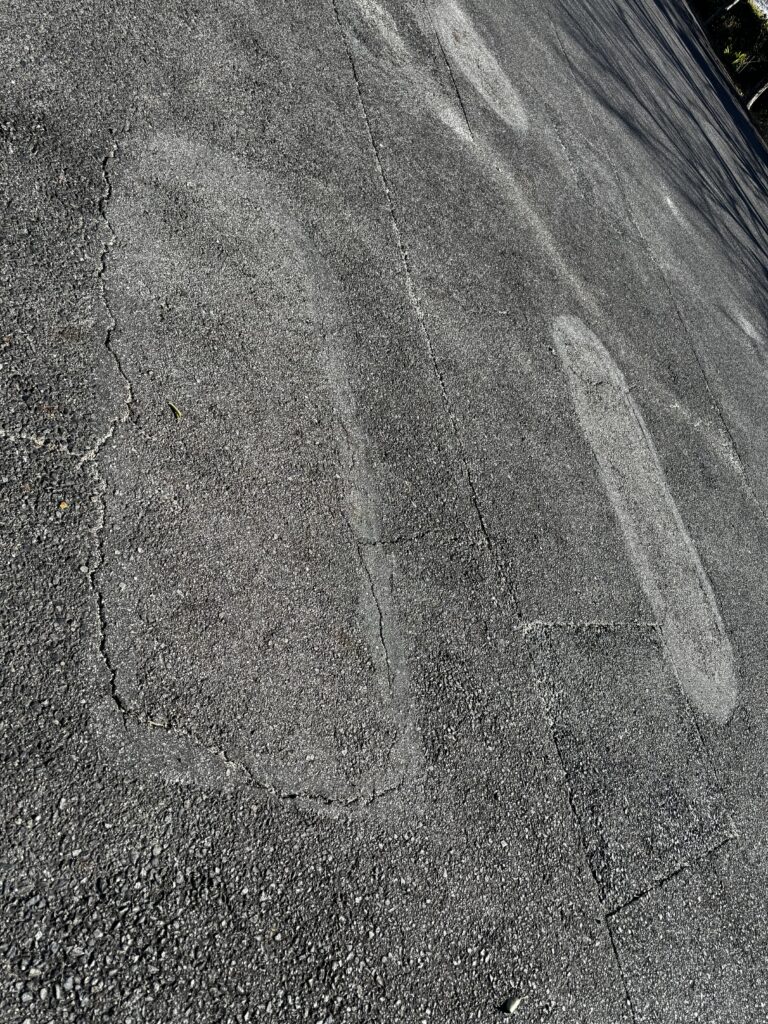 そこには、アスファルトの色が少し違う部分があって、確かに大きな足跡のようにも見える。ボクにはただの色ムラにしか見えなかったけど、長男にとっては「巨人が歩いた証拠」だったらしい。