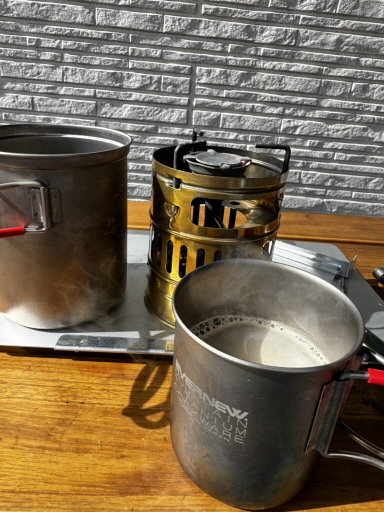 玄関でキャンプ道具を使いお湯を沸かすのは、ずっと続けている習慣です。忙しい日々の中でも、ちょっとだけひとりの時間が取れたときに、ふとやりたくなります。