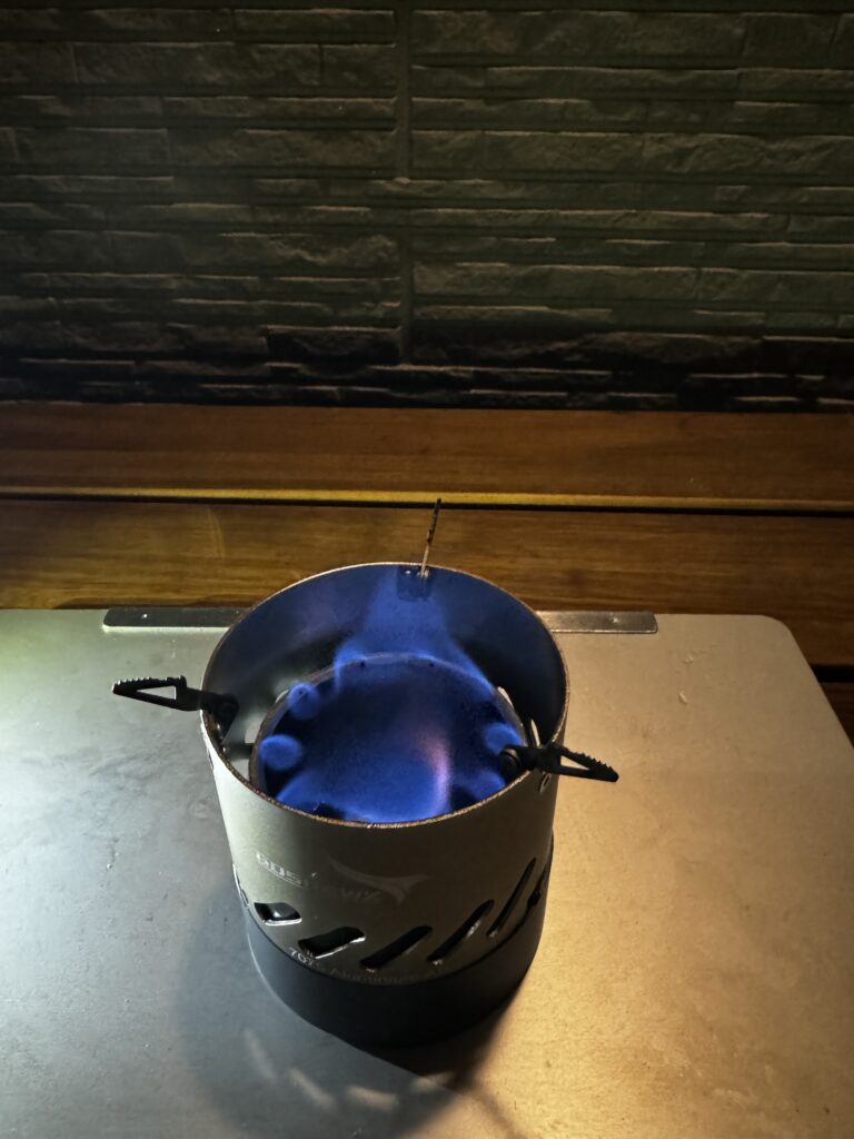 Goshawkのアルストは、高火力なので短時間で湯沸かししたい時などに気軽に使えます。今回もいつもの玄関湯沸かしで使ってみることにしました。アルストは、火を見ながらお湯を沸かすという行為そのものが楽しさを感じさせてくれます。小さな火がじっくり燃える様子を見ていると、なんだか落ち着くんですよね。
