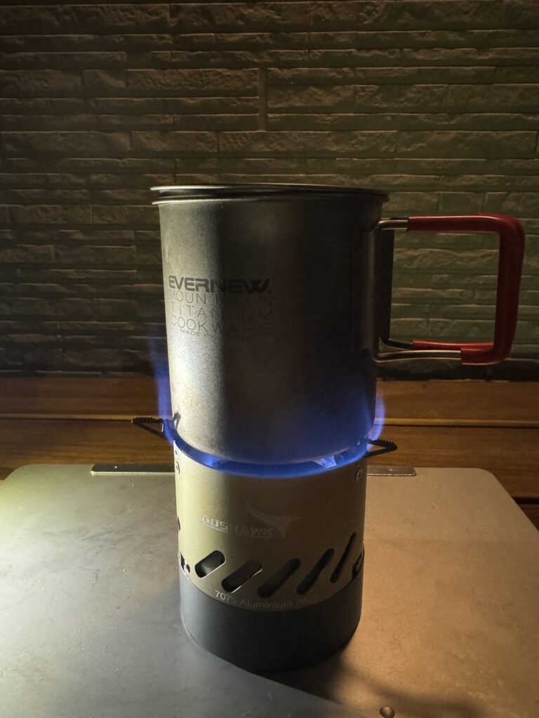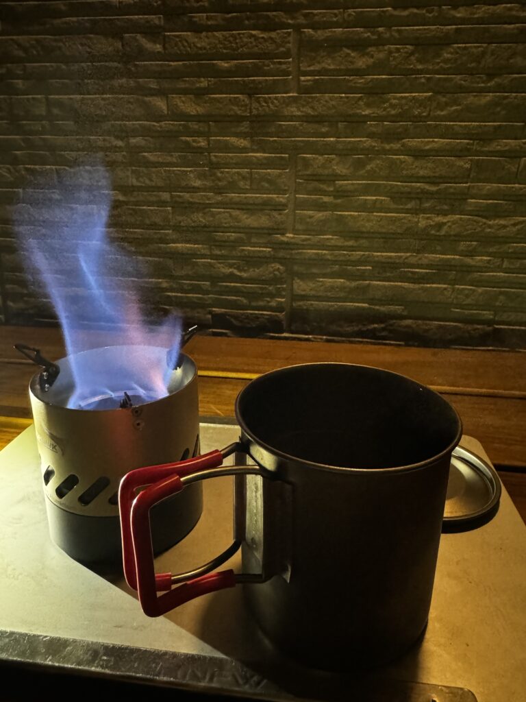 今日は、ただGoshawkのアルコールストーブを使いたくて、玄関でお湯を沸かしてホットはちみつレモンを作ることにしました。特に理由はないのですが、ちょっとした気分転換にアルストを使ってみたかったんです。