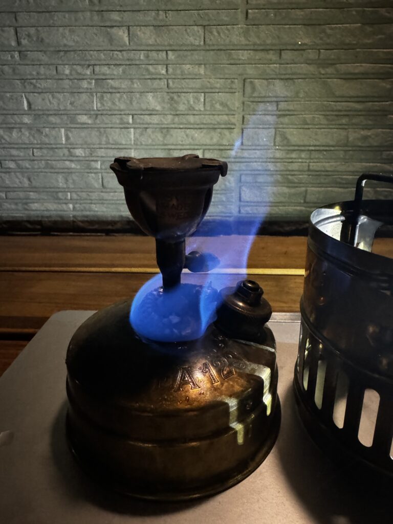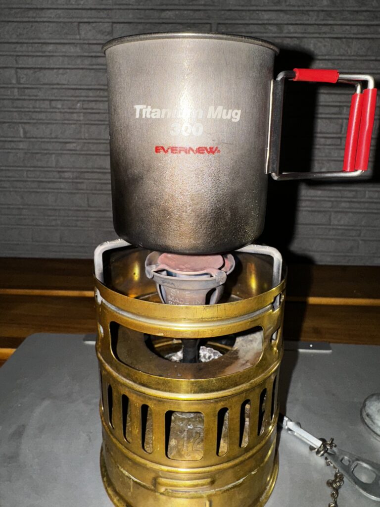 外は雨。静かな夜、雨音をBGMにスベア123に点火します。