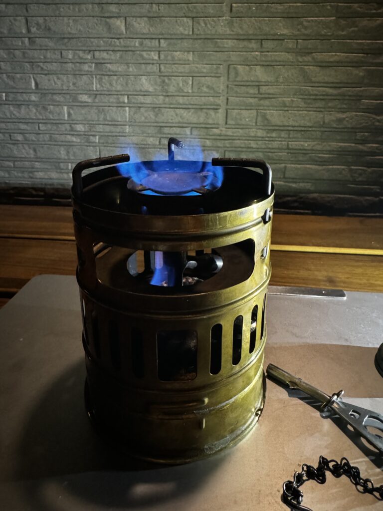 プレヒートの炎がゆらめき、バーナーヘッドがしっかり温まると、力強い燃焼音が響きます。
