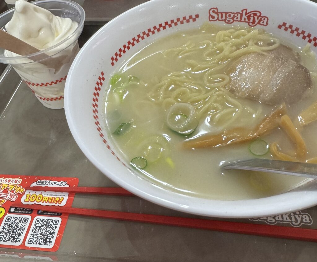 • ラーメン:スガキヤ定番の和風とんこつスープは安定の美味しさ。シンプルだけどクセになる味!