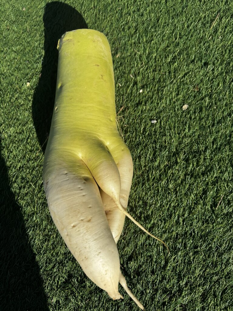 よく見ると、根の部分がまるで足のように見えてきませんか?こういう大根ができる理由は、土の中で成長する過程で障害物があったり、気温や栄養の影響を受けたりするからだそうです。自然の偶然が生み出したアートですね。