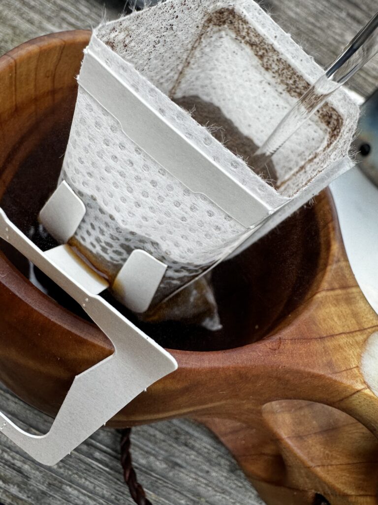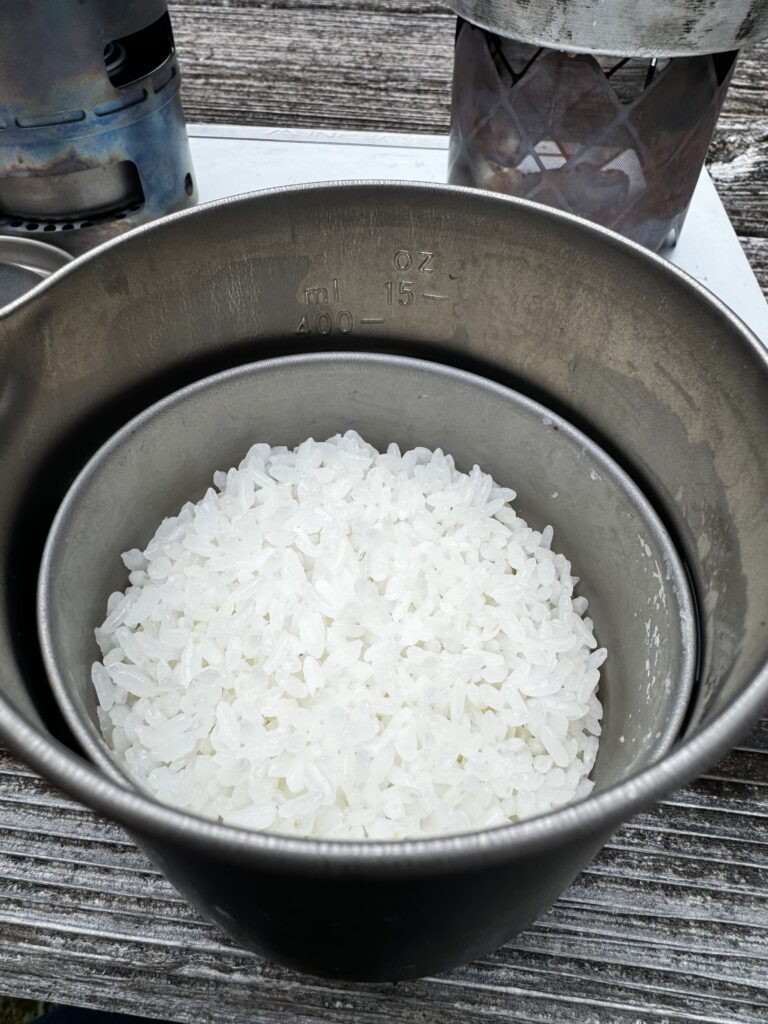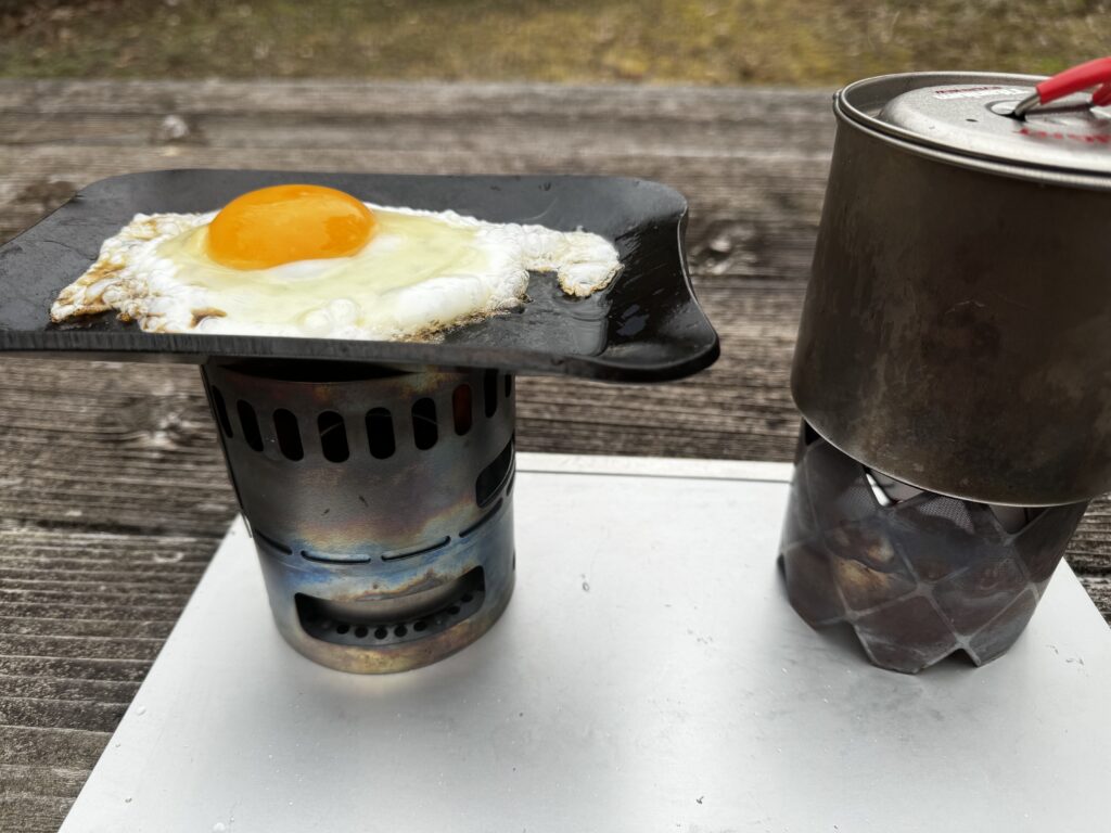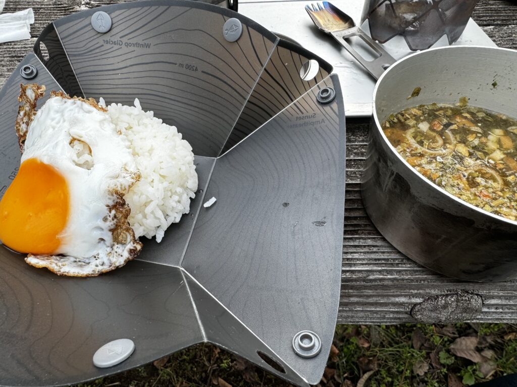 メニューは前日と同じく、エバニューチタンマグポット500とベルモントチタントレールカップ280を使って水蒸気炊飯を行い、鉄板で目玉焼きを焼きました。インスタント味噌汁も添えて、シンプルながら満足のいく朝食となりました。食後にはドリップバッグコーヒーを淹れ、朝の静かな時間を楽しみました。