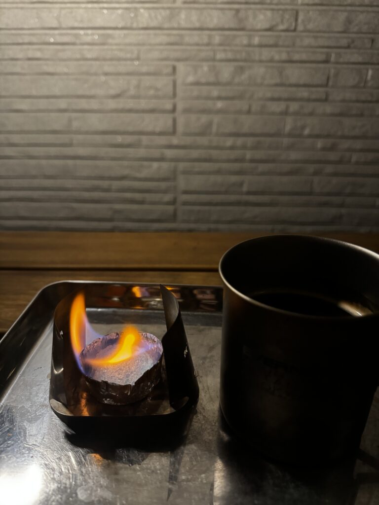 この日は、固形燃料と簡易風防を使ってチタンマグでお湯を沸かし、スティックコーヒーを淹れるだけのシンプルな時間。