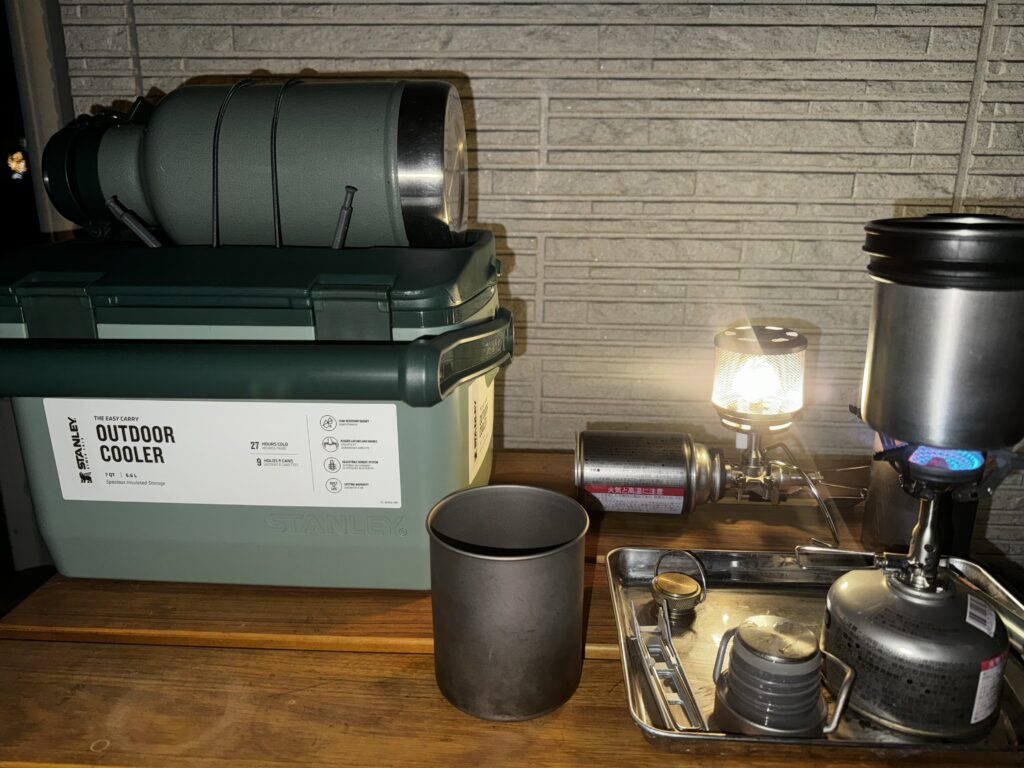 スタンレーのハードクーラー(スタンレーグリーン)が届いたので、うれしくってグロウラーと一緒に玄関に出して眺めていました。質感もカラーも想像以上に好みで、しばらく見ているだけで満足感があります。
