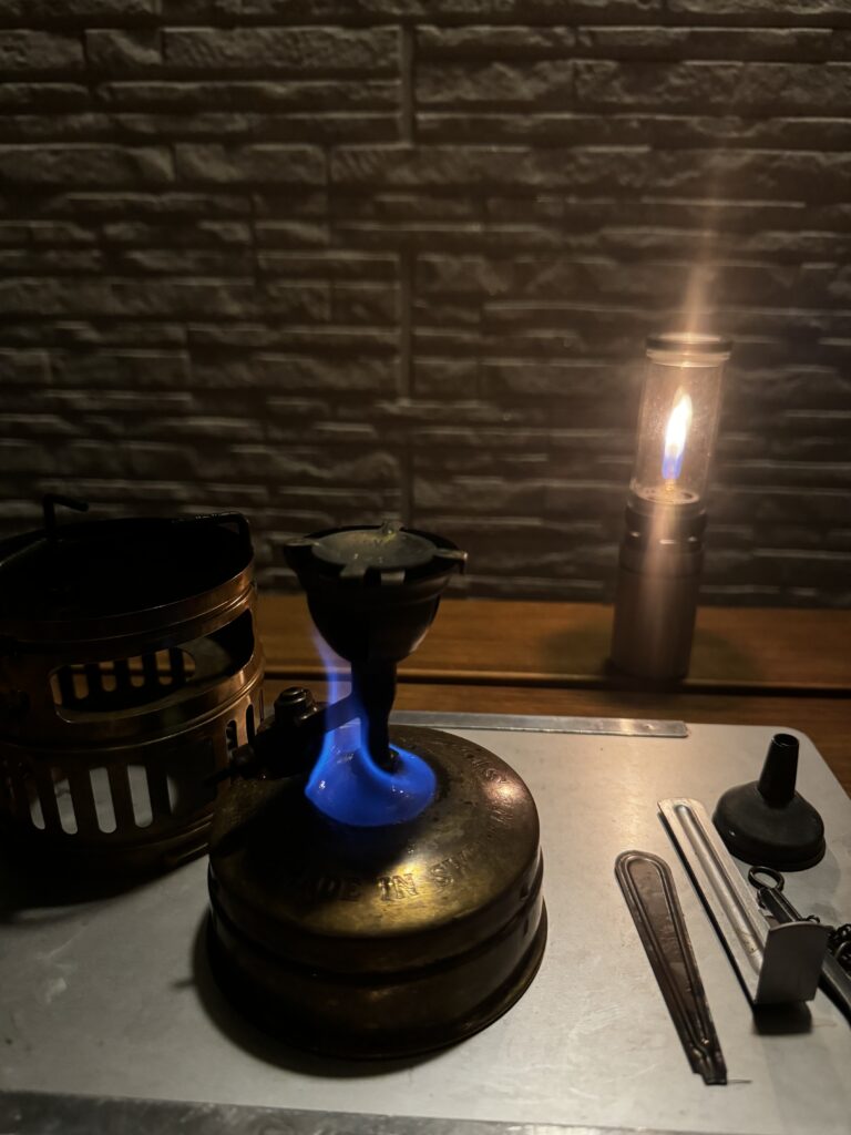 ひのとの灯りの下で、湯沸かしはスベア123で行いました。小さくて軽いこのストーブは、コンパクトで使いやすいです。お湯を沸かしてホットはちみつレモンを作りながら、外の空気を感じ、今日の出来事をひとりで振り返ることができました。