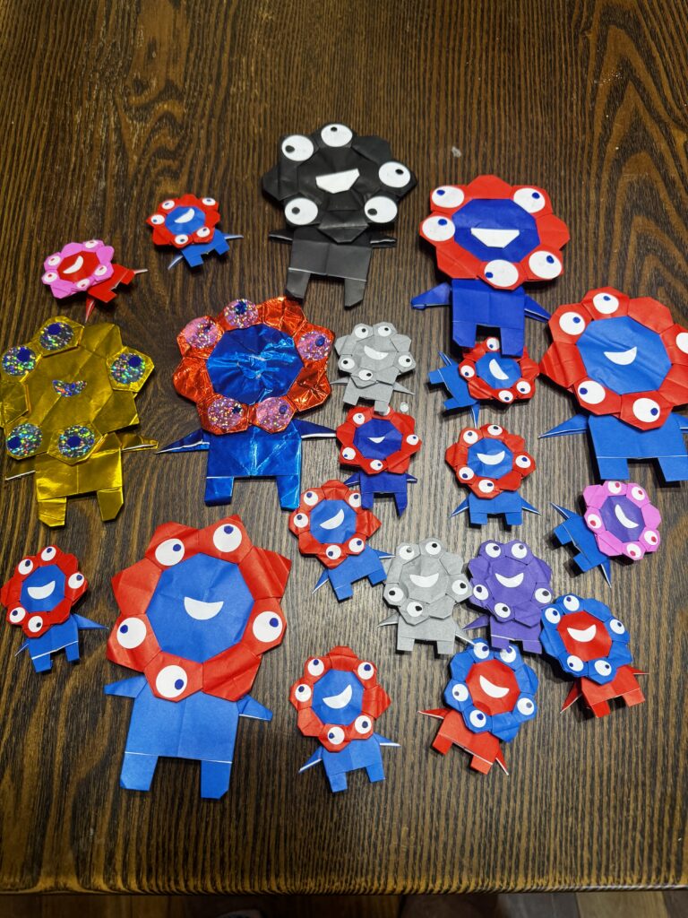 最初は「ちょっと作ってみようかな」くらいのノリだったのに、気づけばなんと20体以上のミャクミャクを折ってる奥さん。小さなミャクミャクから、ブラックミャクミャク、金色ミャクミャクまで、バリエーションがすごい。