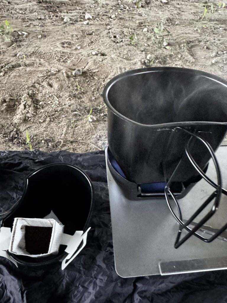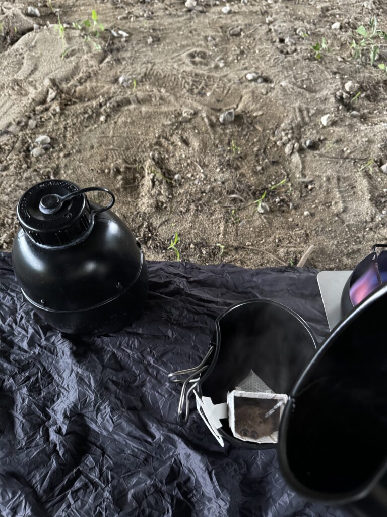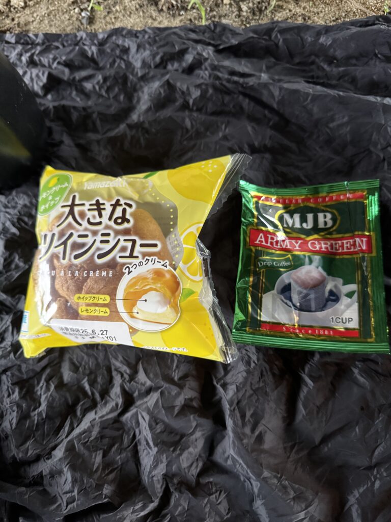 コーヒーは、業務スーパー アミカで買ったドリップパックの“アーミーグリーン”。