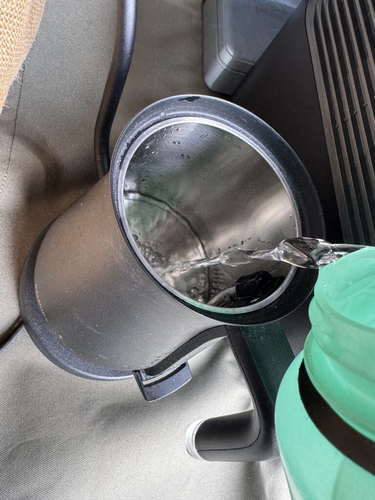 火を使わずに、ポータブル電源と電気ケトルだけで完結する外ごはん。準備も片付けも楽で、気軽に非日常を味わえる体験でした。