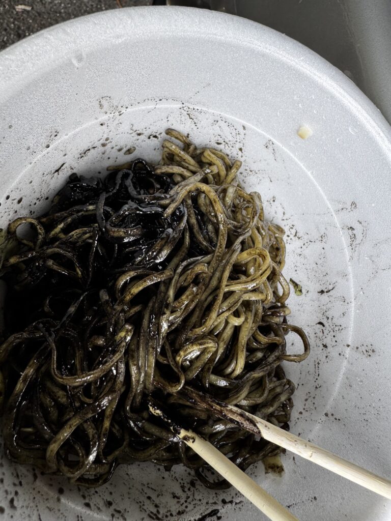 お湯を注いで5分待って完成した、エガちゃん×ファミマ限定のイカ墨まぜそば。それを外で、しかも火を使わずに食べるという贅沢。