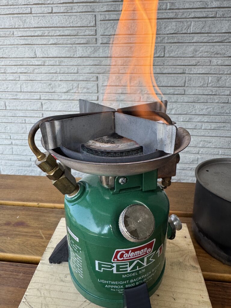 以前にも同じようなことがあり、そのときはタンクに入れた燃料が少なくてしっかり圧がかからなかったのではないかと考えました。そこで、一度消火して冷ましてから燃料を追加し、あらためて手順通りにポンピング、レバーオンで着火し、さらに追いポンピングを行いました。すると、今度はしばらくして本燃焼に入り、きれいな青火で燃えてくれました。