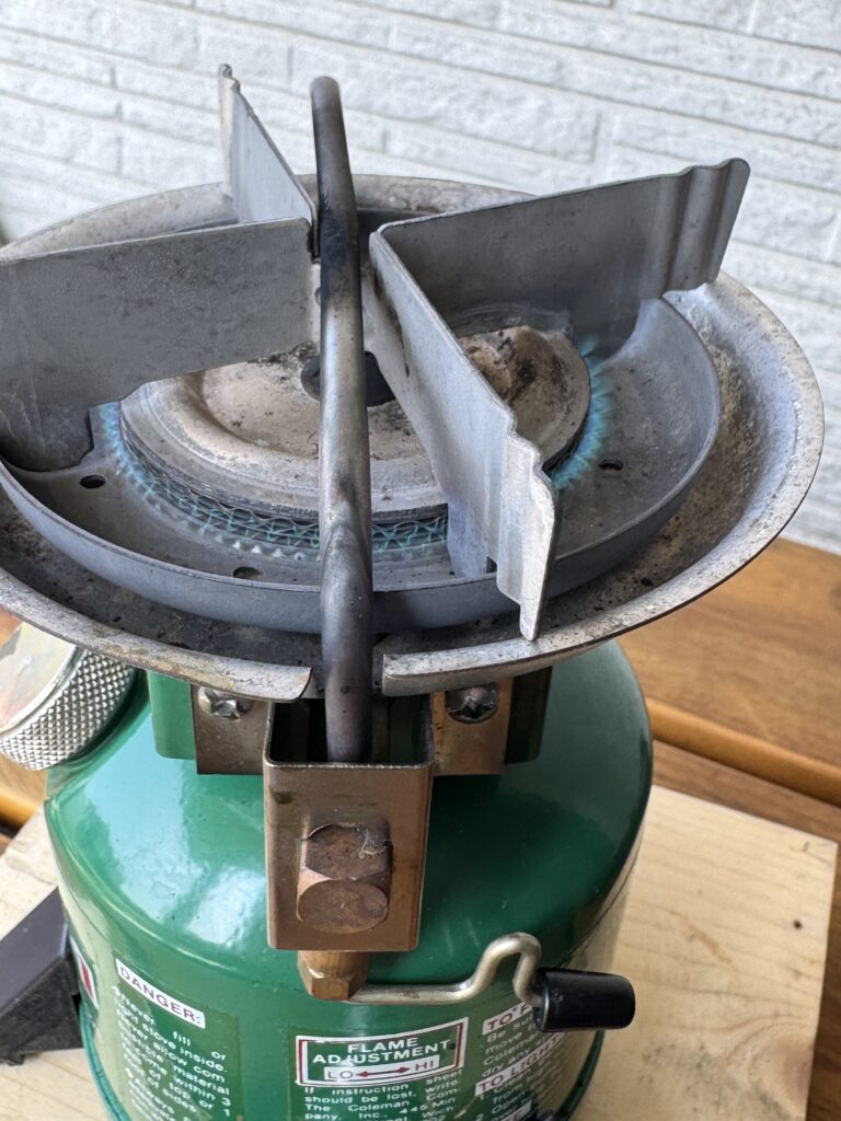 今日は久しぶりにコールマン576ピーク1でお湯を沸かしてコーヒーを淹れようと思い、燃料を入れてポンピングして着火しました。通常であれば、しばらく燃焼して本体が温まると青火になって安定燃焼するのですが、このときはずっと赤火のままで本燃焼になりませんでした。