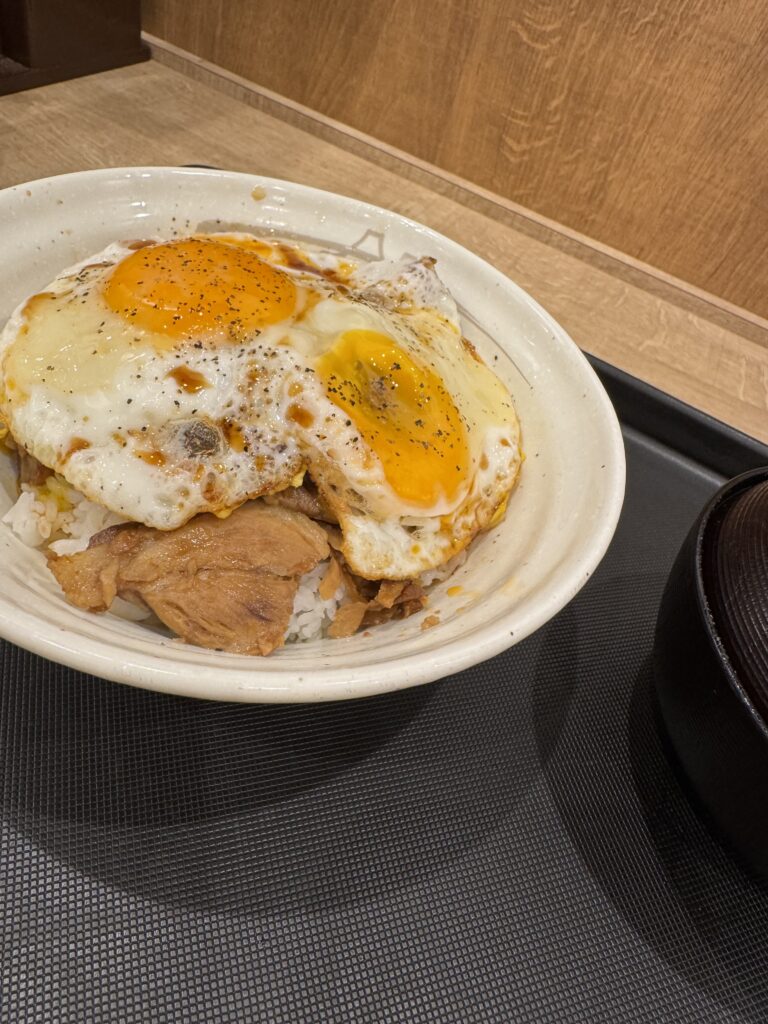 出てきたのは、ご飯の上に焼豚がのって、さらに玉子がとろりとかかった一品。実際に食べてみると、本場今治で味わったものとは少し違っていて、最初は「あれ?」という気持ちになりました。