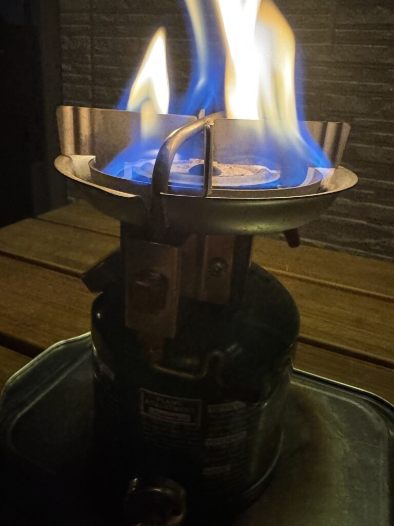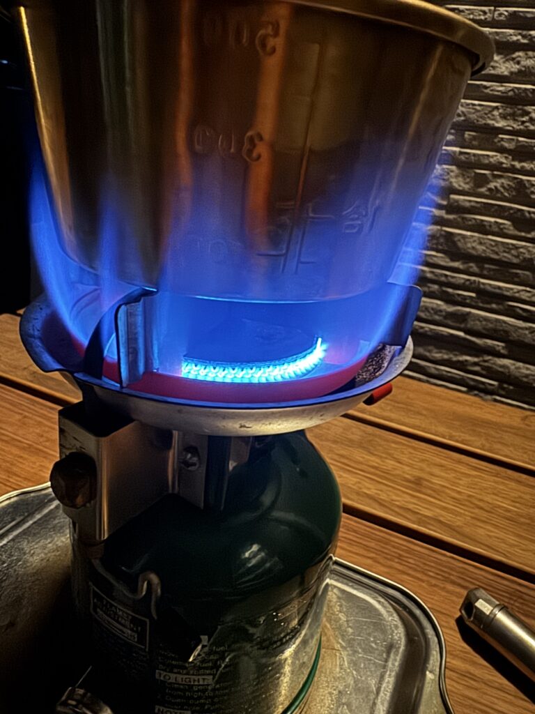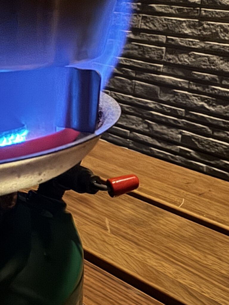 前日にコールマン508Aを使って楽しんだ流れで、翌日はコールマン576ピーク1を持ち出しました。いつもどおり燃料を入れてポンピングして、着火。しっかり燃焼してくれましたが、少し赤火が出てしまいました。