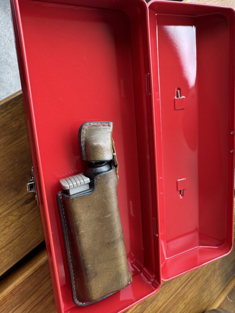 緑を狙っていたので一瞬「あれっ」と思いましたが、実物を手にすると赤もとてもカッコいいんです。写真で見るより鮮やかで、存在感があります。入れるもの決めていなかったけど、ひとまずライターとかの着火道具をいれてみます、定番ですね笑